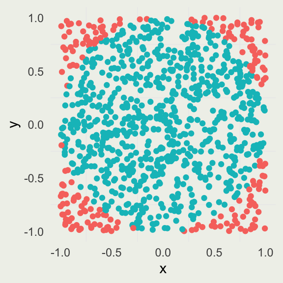 The idea is that we can approximate the ratio of the area of an inscribed circle, \(A_c\), to the area of the square, \(A_s\), by uniformly “throwing darts” at the square with the side \(2r\) and counting how many darts land inside the circle versus inside the square.