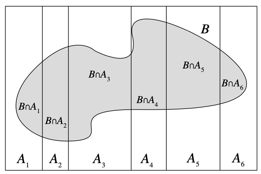 Let \(A\) be a partition of \(\Omega\), so that each \(A_i\) is disjoint, \(\P(A_i >0)\), and \(\cup A_i = \Omega\). \[ \P(B) = \sum_{i=1}^{n} \P(B \cap A_i) = \sum_{i=1}^{n} \P(B \mid A_i) \P(A_i) \]