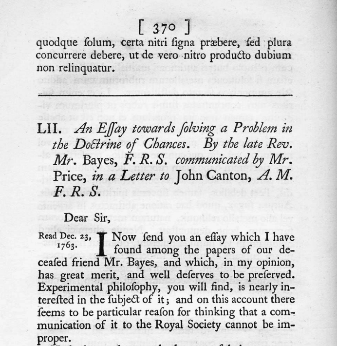 \[ \P(A \mid B) = \frac{\P(A \cap B)}{\P(B)} = \frac{\P(B \mid A) \P(A)}{\sum_{i=1}^{n} \P(B \mid A_i) \P(A_i)} \]