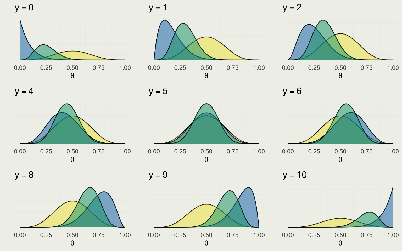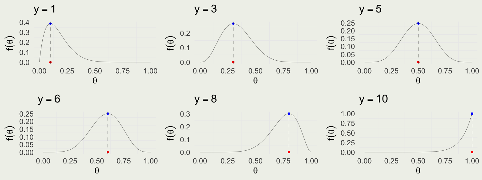 Assuming \(N = 10\), the likelihood for \(\theta\), given a few possible values of \(y\) successes