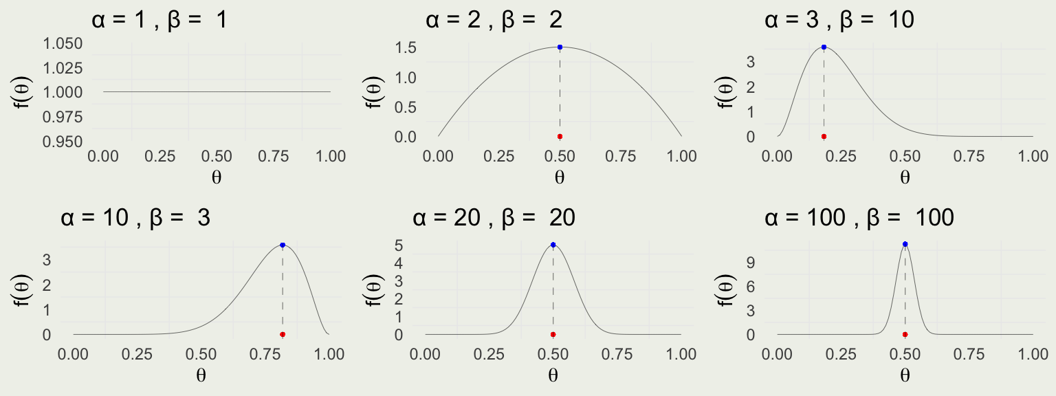 Notice when \(\alpha = \beta\), \(\E(\theta) = \text{Mode}(\theta)\)