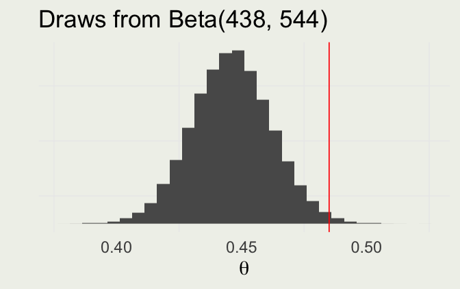 cat("95% posterior interval is [", lower, ", ", upper, "]", sep = "")95% posterior interval is [0.415, 0.477]
