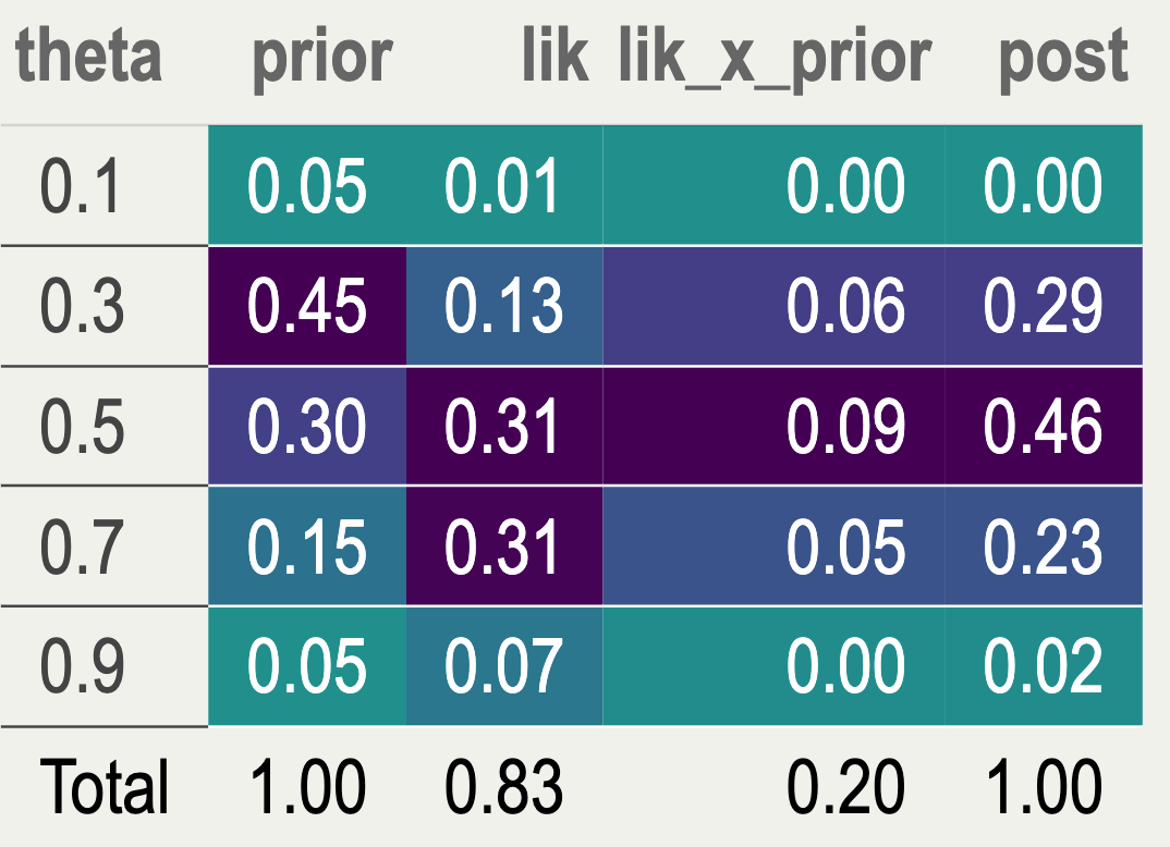 \[ \begin{eqnarray} \E(\theta \mid y) & = & \frac{\alpha + y}{\alpha + \beta + n} = \frac{\alpha + \beta}{\alpha + \beta + n}\cdot \E(\theta) + \frac{n}{\alpha + \beta + n}\cdot\frac{y}{n} \\ \V(\theta \mid y) & = & \frac{(\alpha + y)(\beta + n - y)}{(\alpha + \beta + n)^2(\alpha + \beta + n + 1)} \\ \text{Mode}(\theta \mid y) & = & \frac{\alpha + y - 1}{\alpha + \beta + n - 2} = \frac{\alpha + \beta - 2}{\alpha + \beta + n - 2} \cdot\text{Mode}(\theta) + \frac{n}{\alpha + \beta + n - 2} \cdot\frac{y}{n} \end{eqnarray} \]