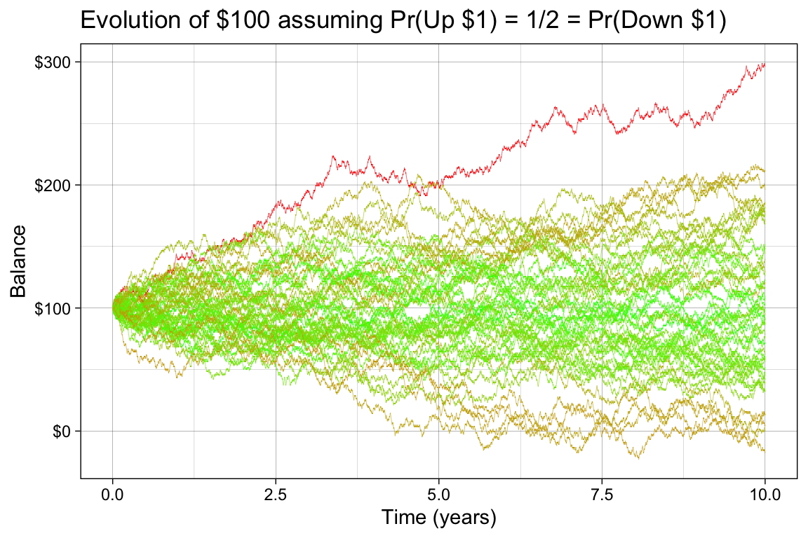 library(ggplot2)library(tidyr)library(dplyr)library(scales)set.seed(1234)W <-100LPr <-0.5N <-365L *10L # 10 yearsn <-50L # compute 50 possible futuresrun_chain <-function(N, p, w) { s <-sample(c(-1, 1), size = N, prob =c(p, 1-p), replace =TRUE) balance <- w +cumsum(s)return(balance)}chains <-replicate(n, run_chain(N, Pr, W))chains_df <-as.data.frame(chains) |>mutate(Time =1:n())chains_df <- chains_df |>pivot_longer(cols =-Time, names_to ="Chain", values_to ="Value" )# color more extreme futures more red and less extreme more greenextremeness <- chains_df |>group_by(Chain) |>summarize(extreme =max(abs(Value - W)), .groups ="drop")chains_df <-left_join(chains_df, extremeness, by ="Chain")ggplot(chains_df, aes(x = Time/365, y = Value, group = Chain, color = extreme)) +geom_line(linewidth =0.1) +labs(title ="Evolution of $100 assuming Pr(Up $1) = 1/2 = Pr(Down $1)", x ="Time (years)", y ="Balance") +scale_color_gradient(low ="green", high ="red") +scale_y_continuous(labels =dollar_format()) +theme(legend.position ="none")