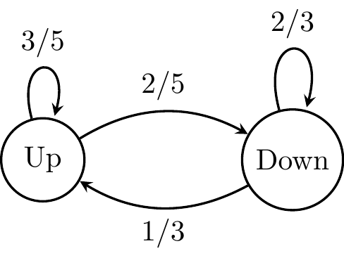 As an example of a finite, discrete state space, consider a market that could go up or down daily. If it is an up day, we assume that tomorrow will be an up day with probability 3/5 and a down day with probability 2/5. If it is a down day, tomorrow will be a down day with probability 2/3 and an up day with probability 1/3. This kind of mild memory encodes the fact that there is a slightly higher probability of going down if we are in the down day than going up if we are in the up day.