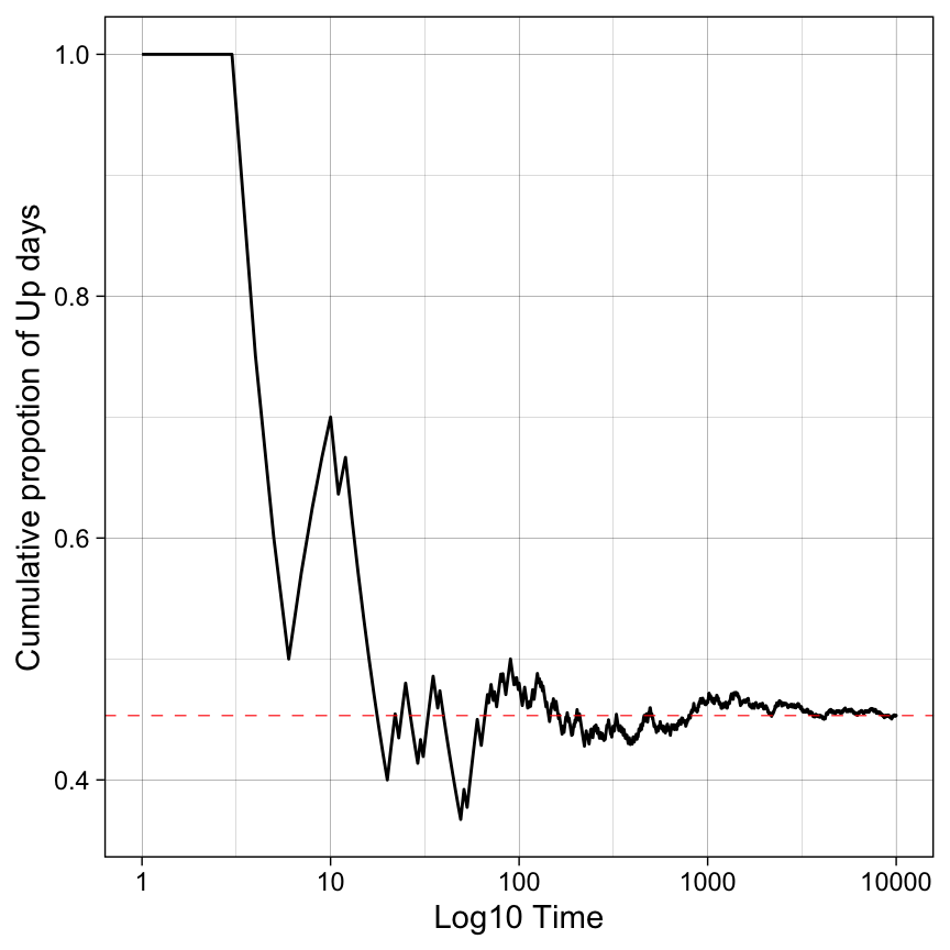 library(expm)T <-1e4states <-c(1, 0) # 1: up day, 0: down dayy <-numeric(T)Q <-matrix(c(3/5, 2/5, 1/3, 2/3), ncol =2, byrow =TRUE)y[1] <-1# start in the up dayfor (t in2:T) {if (y[t-1] ==1) { y[t] <-sample(states, size =1, prob =c(Q[1, 1], Q[1, 2])) } else { y[t] <-sample(states, size =1, prob =c(Q[2, 1], Q[2, 2])) }}cummean <-cumsum(y) /seq_along(y)p <-ggplot(aes(t, y), data =data.frame(t =1:T, y = cummean))p +geom_line(linewidth =0.5) +scale_x_log10() +geom_hline(yintercept =mean(y), linewidth =0.2, linetype ="dashed", color ='red') +ylab("Cumulative propotion of Up days") +xlab("Log10 Time")