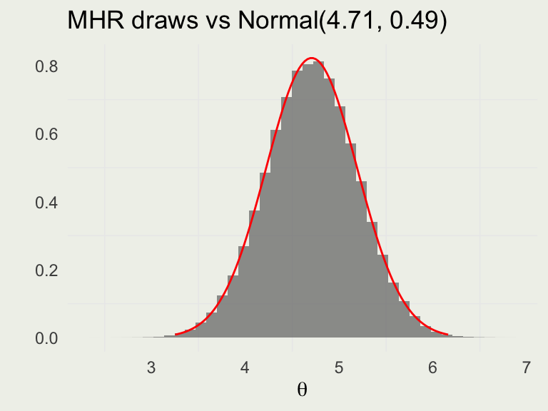 np <-normal_normal_post(y = y, sd =0.5, prior_mu =0, prior_sd =2)theta <-seq(np$post_mu +3*np$post_sd, np$post_mu -3*np$post_sd, len =100)dn <-dnorm(theta, mean = np$post_mu, sd = np$post_sd)p <-ggplot(aes(d), data =tibble(d = d))p +geom_histogram(aes(y =after_stat(density)), bins =40, alpha =0.6) +geom_line(aes(theta, dn), linewidth =0.5, color ='red', data =tibble(theta, dn)) +ylab("") +xlab(expression(theta)) +ggtitle("MHR draws vs Normal(4.71, 0.49)")
