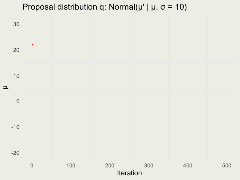 metropolis_iteration_1 <-function(y, current_mean, proposal_scale, sd, prior_mean, prior_sd) {# assume prior ~ N(prior_mean, prior_sd) and sd is known# proposal sampling distribution q = N(current_mean, proposal_scale) proposal_mean <-rnorm(n =1, mean = current_mean, sd = proposal_scale) # q(mu' | mu) f_proposal <-dnorm(proposal_mean, mean = prior_mean, # proposal prior, f(theta')sd = prior_sd) *dnorm(y, mean = proposal_mean, sd = sd) # proposal lik, f(y | theta') f_current <-dnorm(current_mean, mean = prior_mean, # current prior, f(theta)sd = prior_sd) *dnorm(y, mean = current_mean, sd = sd) # current lik, f(y | theta) ratio <- f_proposal / f_current # [f(theta') * f(y | theta')] / [f(theta) * f(y | theta)] alpha <-min(ratio, 1) if (alpha >runif(1)) { # this is just another way of flipping a coint next_value <- proposal_mean } else { next_value <- current_mean }return(next_value)}