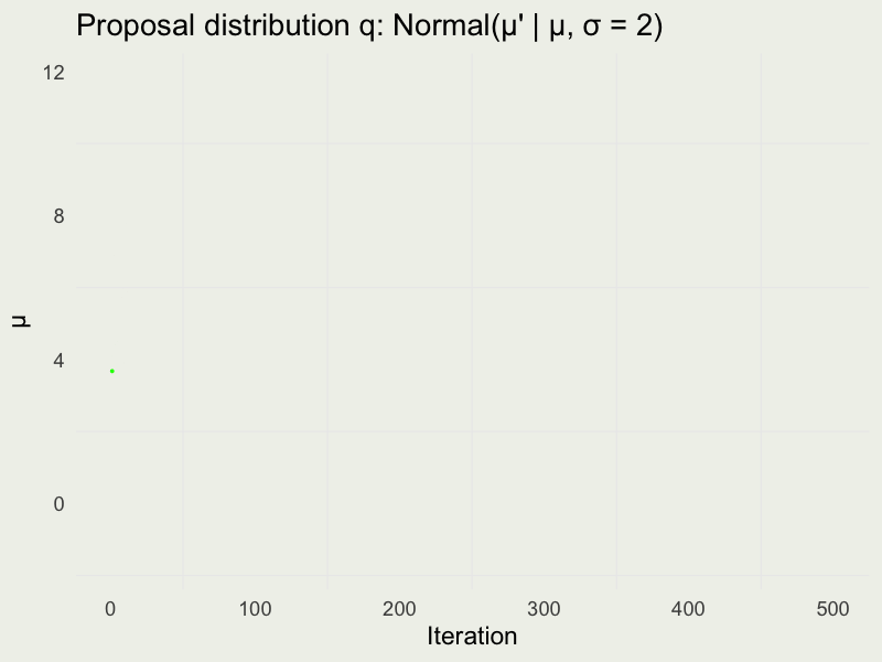 metropolis_iteration_2 <-function(y, current_mean, proposal_scale, sd, prior_mean, prior_sd) { proposal_mean <-rnorm(1, current_mean, proposal_scale) f_proposal <-dnorm(proposal_mean, mean = prior_mean, sd = prior_sd) *prod(dnorm(y, mean = proposal_mean, sd = sd)) f_current <-dnorm(current_mean, mean = prior_mean, sd = prior_sd) *prod(dnorm(y, mean = current_mean, sd = sd))if ((f_proposal || f_current) ==0) {return("Error: underflow") # on my computer double.xmin = 2.225074e-308 } ratio <- f_proposal / f_current alpha <-min(ratio, 1) if (alpha >runif(1)) { # definitely go if f_mu_prime > f_mu: alpha = 1 next_value <- proposal_mean # if alpha < 1, go if alpha > U(0, 1) } else { next_value <- current_mean }return(next_value)}
