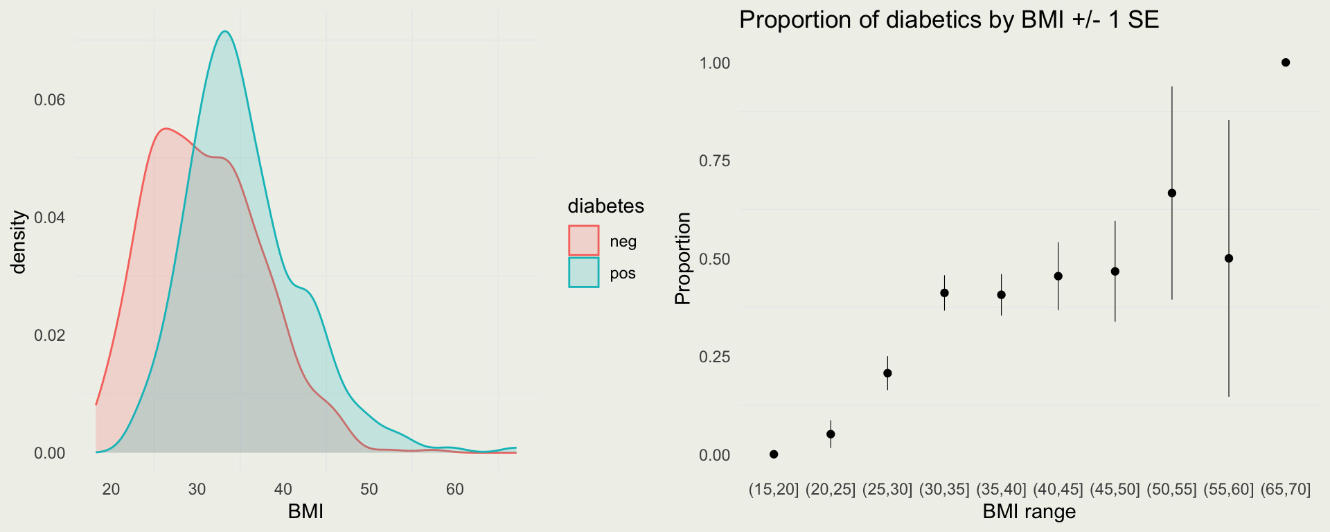 ggtitle("Proportion of diabetics by BMI +/- 1 SE")