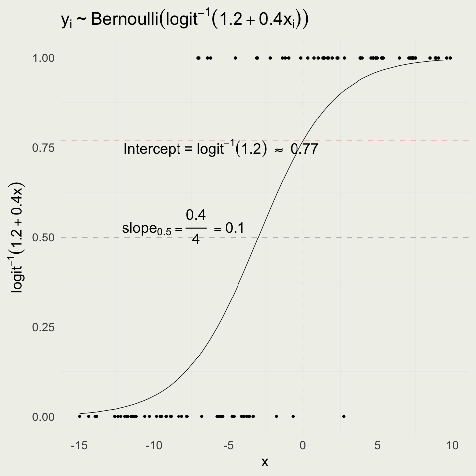 label = TeX("Intercept = $logit^{-1}(1.2)$ \\approx 0.77")) +