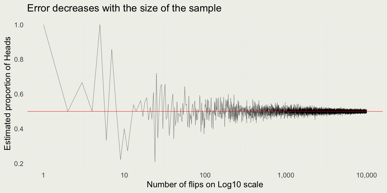 ggtitle("Error decreases with the size of the sample")We can see some evidence for the Law of Large Numbers.