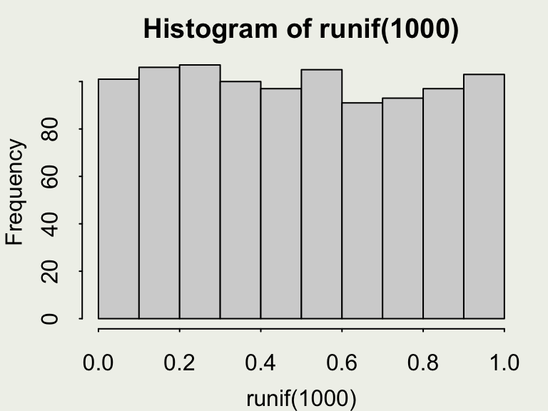 sample() function: runif(n, min = 0, max = 1)runif generates realizations of a random variable uniformly distributed between min and max.