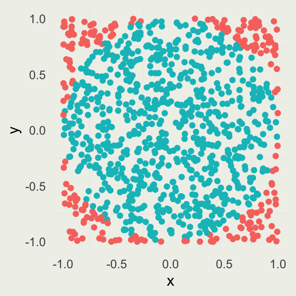 mean(runif(1e3, min = -1, max = 0))? Guess before running it.The idea is that we can approximate the ratio of the area of an inscribed circle, \(A_c\), to the area of the square, \(A_s\), by uniformly “throwing darts” at the square with the side \(2r\) and counting how many darts land inside the circle versus inside the square.