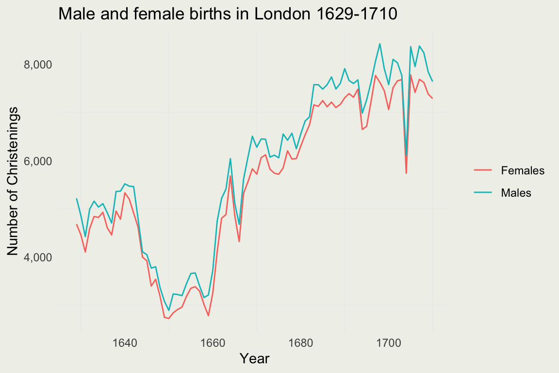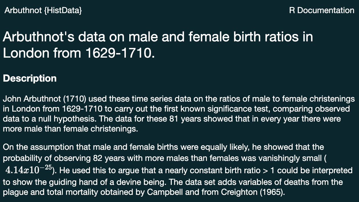 install.packages('HistData')library(HistData)?Arbuthnot| Year | Males | Females | Plague | Mortality | Ratio | Total |