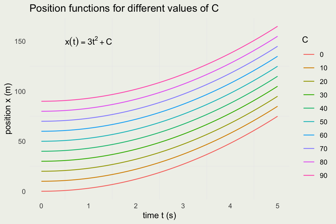 The position function for different values of initial position \(C\). Notice that the only thing that changes is the intercept.