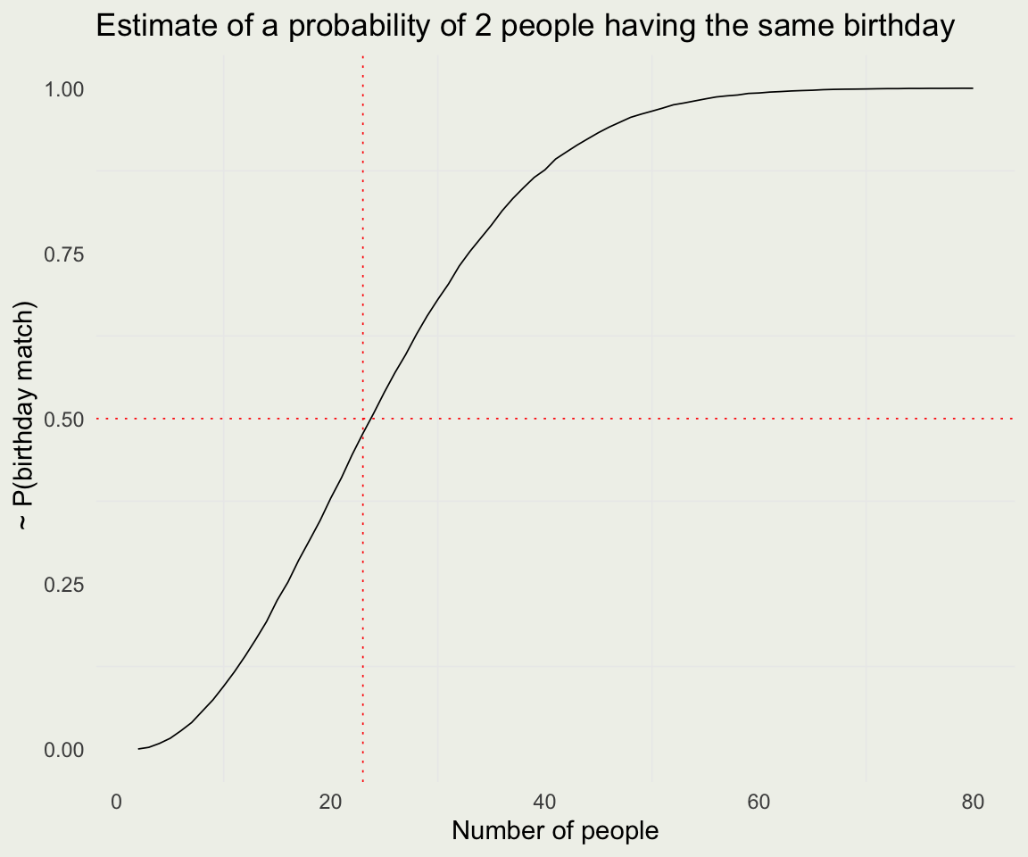\[ \P(\text{At least one match}) = 1 - P(\text{No match}) = \\ 1 - \frac{\prod_{i = 0}^{j-1} (365-i)}{365^j} = 1 - \frac{365 \cdot 364 \cdot 363 \cdot \,... \, \cdot (365 - j + 1)}{365^j} \]