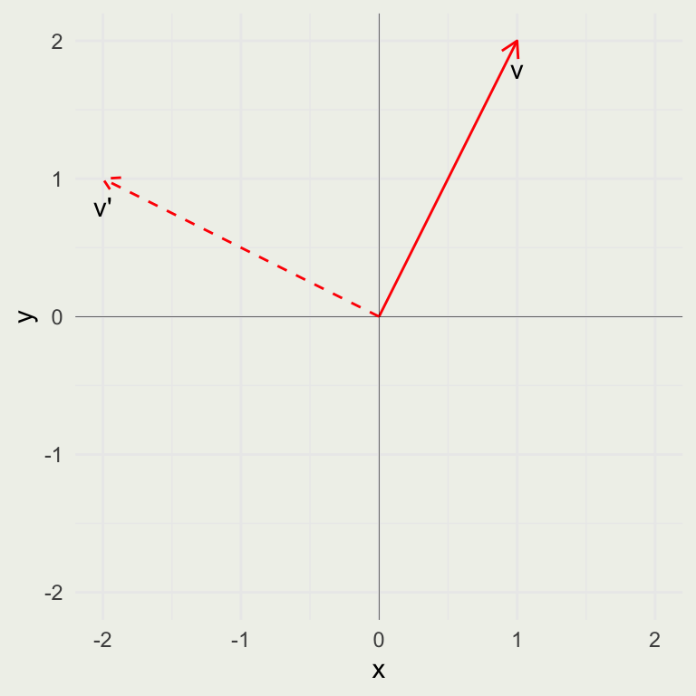 \[ Rv = \begin{bmatrix} 0 & -1 \\ 1 & 0 \end{bmatrix} \begin{bmatrix} 1 \\ 2 \end{bmatrix} = 1 \begin{bmatrix} 0 \\ 1 \end{bmatrix} + 2 \begin{bmatrix} -1 \\ 0 \end{bmatrix} = \begin{bmatrix} 0 \\ 1 \end{bmatrix} + \begin{bmatrix} -2 \\ 0 \end{bmatrix} = \begin{bmatrix} -2 \\ 1 \end{bmatrix} \]