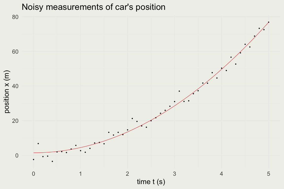 We assumed the equation of motion was \(x(t) = a + bt^2\), which we will write as \(y(t) = \beta_0 + \beta_1 t^2\)