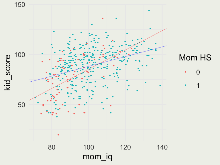 For \(\text{mom_hs} = 1\), the line is: \(\text{kid_score} = -10 + 49 \cdot 1 + 1 \cdot \text{mom_iq} - 0.5 \cdot 1 \cdot \text{mom_iq} = 39 + 0.5\cdot \text{mom_iq}\)
