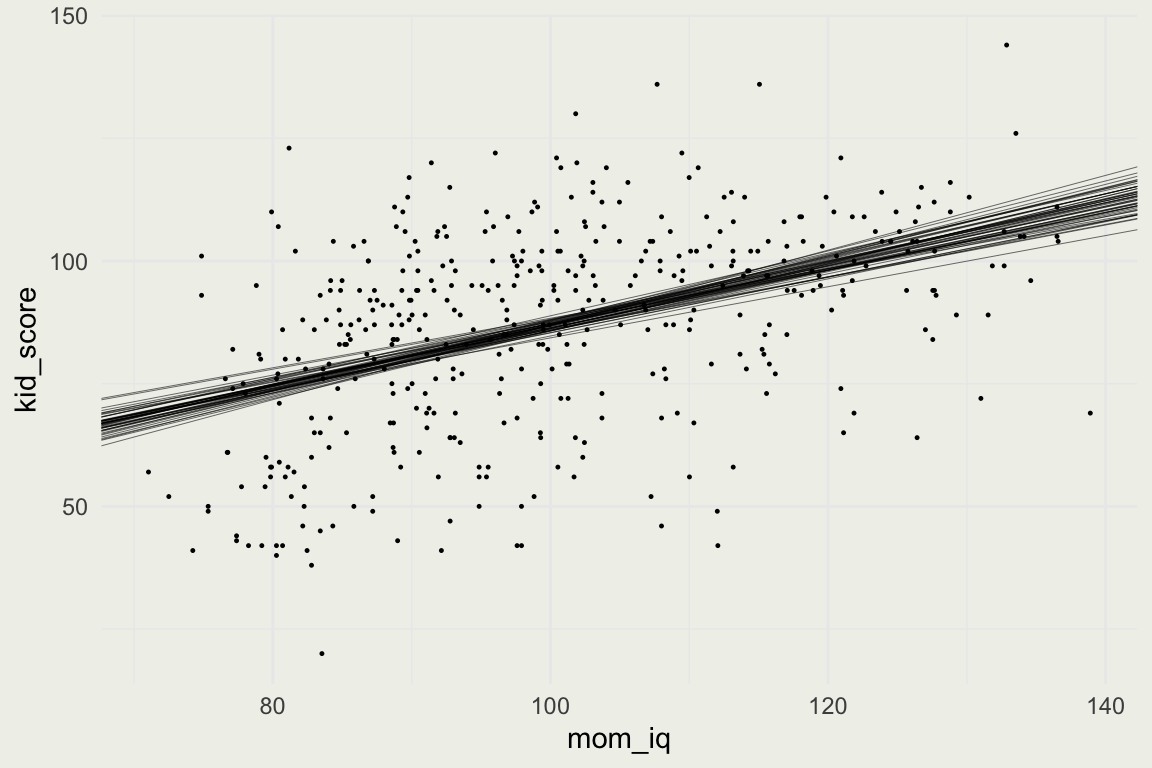 We return to our simple linear regression model: \(\text{kid_score} = 26 + 0.6 \cdot \text{mom_iq}+ \epsilon\)