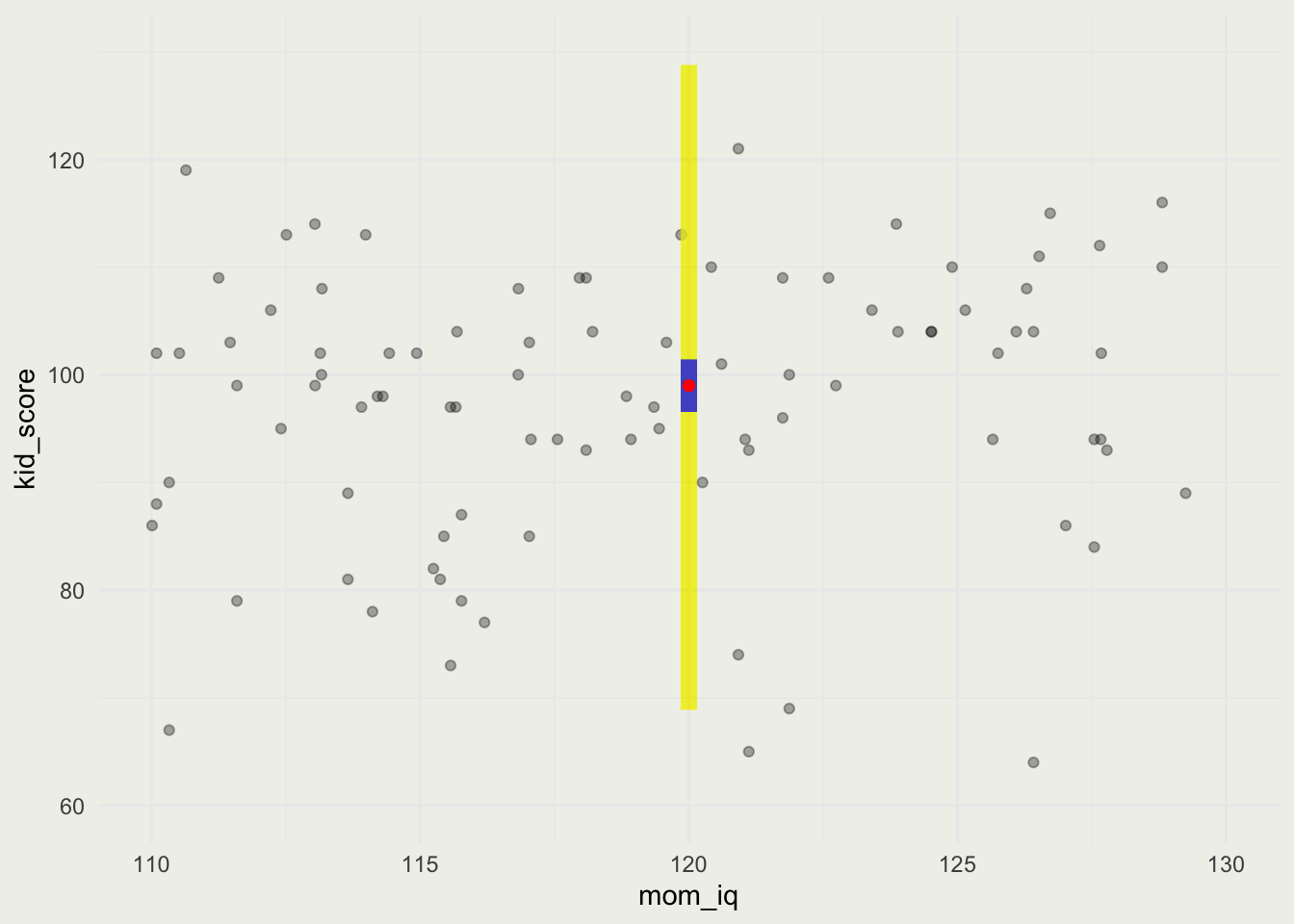 Point prediction is shown in Red, 90% uncertainty around the average kid score in Blue, and 90% predictive uncertainty for a new kid is in Yellow.