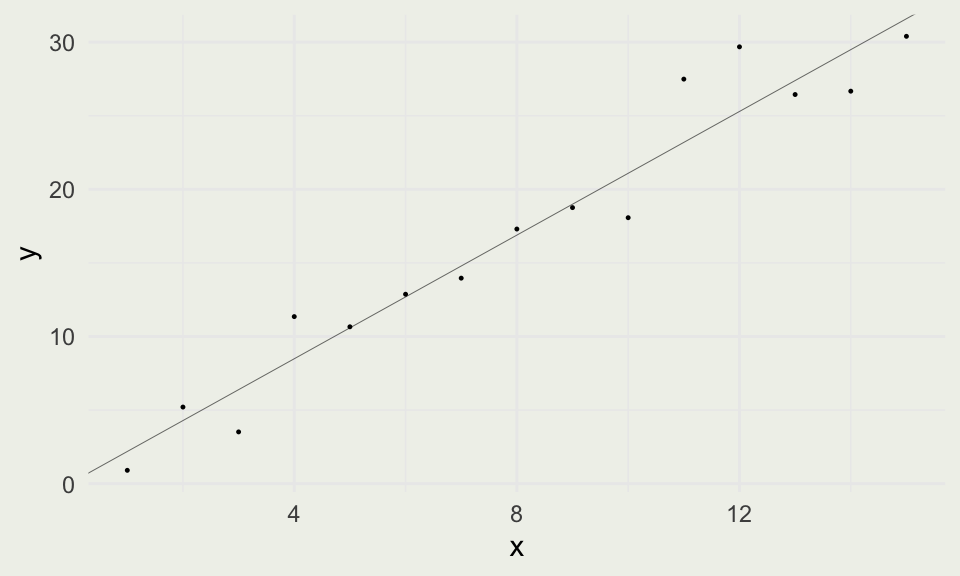 library(rstanarm)n <-15; x <-1:na <-0.5b <-2sigma <-3y <- a + b*x +rnorm(n, mean =0, sd = sigma) # or sigma * rnorm(n)data <-data.frame(x, y)fit1 <-stan_glm(y ~ x, data = data, refresh =0) print(fit1)