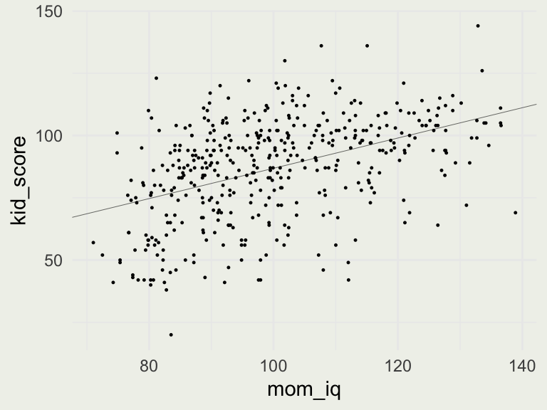 p <-ggplot(aes(mom_iq, kid_score), data = kidiq)p +geom_point(size =0.2) +geom_abline(intercept =coef(fit3)[1], slope =coef(fit3)[2], linewidth =0.1)